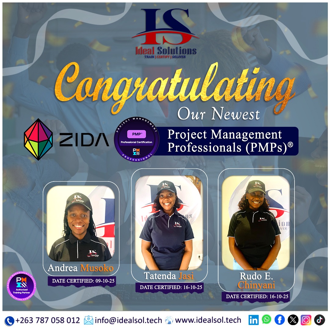 As the new week begins with fresh energy and bold ambition, IDEAL SOLUTIONS (Project Management) proudly celebrates a remarkable milestone in leadership and excellence. Three exceptional women from the Zimbabwe Investment & Development Agency – ZIDA have successfully earned the globally acclaimed Project Management Professional (PMP®) certification, a symbol of mastery, resilience, and strategic leadership.